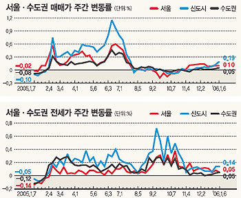 신도시는 일산(0.4%), 평촌(0.14%), 분당(0.11%) 등이 소폭 올랐고 중동은 보합세,산본(-0.02%)은 약세를 보였다.