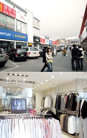 ■사진설명=덕이동 로데오거리의 최고 중심지인 패션1번지. 남성복 전문점들이 대거 운집해 있다.(위 사진) 덕이동 로데오거리 내에 위치한 남성복 전문매장인 '솔리드 옴므'. 하루 평균 매장을 찾는 사람이 200∼300여명에 이른다.(아래 사진)