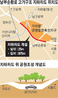 구로구와 금천구가 다시 이어진다. 1986년 남부순환도로가 세워지면서 갈라진지 20년만이다. 서울시는 가리봉 균형발전 사업 추진으로 구로구 가리봉동 디지털단지 5거리∼영일초등학교 간 남부순환로 고가구조를 지하화하고 상부를 공원 및 녹지로 조성하기로 했다고 2일 밝혔다.
