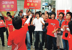 KTF 응원전파단이 23일 서울 광화문역사에서 점심시간을 이용해 직장인들에게 월드컵 응원을 하고 있다.
