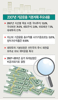 정부가 29일 발표한 ‘2007년도 기금운용계획안’은 국민연금이 내년에 위험자산 투자를 늘리는 게 골자라고 할 수 있다.