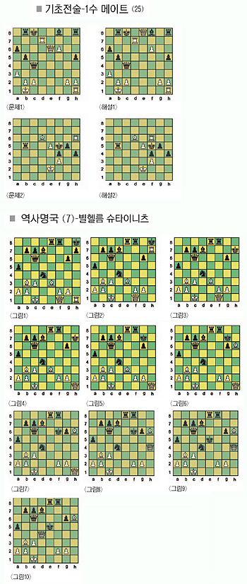 다음 문제들은 모두 백이 선수다. 한 수만에 흑을 체크메이트시킬 수 있는 방법을 찾아보자.