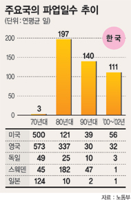 파업의 강도를 뜻하는 ‘분규당 근로손실일수’(근로손실일수÷노동쟁의행위 발생건수)는 4907일로 나타나 지난 88년 이후 줄곧 네자리 숫자를 유지했다. 분규당 근로손실일수가 네 자릿수 이상을 기록하는 나라는 전 세계적으로 우리나라와 영국밖에 없어 우리나라의 파업 강도가 세다는 것을 뜻한다고 연구원측은 설명했다.