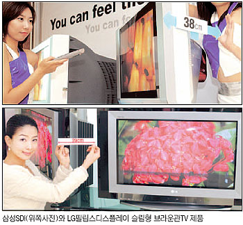 이러다 보니 삼성SDI와 LG필립스디스플레이는 이렇다할 경쟁사 없이 매년 브라운관 사업을 통해 고수익을 올리고 있다. 두 회사는 또 브라운관 제품의 단점인 두께를 줄여 빅슬림 제품 출시를 통해 제2의 전성기를 노리고 있다.
