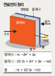양극에선 수소가 이온화되며 전자를 내놓는다. 이 전자는 중간의 전해질을 통해 음극으로 이동하고 그곳에서 공기와 반응해 물을 만든다.