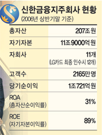 그러나 출범 20년이 채 안된 지난 2001년 4월, 총수신 규모가 40조원을 돌파했다. 게다가 2003년에는 109년 역사의 ‘최고(最古)은행인 조흥은행에 이어 이번에는 LG카드까지 품에 안았다. 단번에 자산규모가 200조원을 넘는 거대 금융그룹으로 급성장한 것이다.