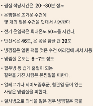 척추관절전문 나누리병원 임재현 부원장은 “온찜질을 하면 손상부위의 혈관을 확장시켜 혈액순환이 빨라지므로 지혈이 안 될 수 있다”며 “따라서 급성손상일 경우 냉찜질로 출혈, 염증, 부종 등을 완화시킨 후 온찜질로 남아있는 통증과 뭉친 근육을 풀어주는 것이 좋다”고 말했다.