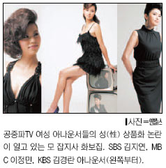 이외에도 지난 21일에는 방송 3사의 현직 아나운서들이 ‘섹시 화보집’을 출간한 것으로 밝혀져 방송계가 또 다시 술렁였다. MBC 이정민, SBS 김지연, KBS 김경란 아나운서들이 찍은 화보집 중 일부는 가슴선과 허벅지까지 드러나 방송계의 여성 상품화라는 비난이 계속됐다.