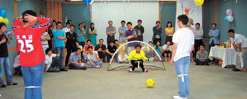 ■사진설명=㈜오리온이 지난 7월 하순 서울 문배동 본사 강당에서 개최한 2006년도 2·4분기 '독수리 시상식' 중 레크리에이션 행사로 진행된 '숏다리 월드컵'에서 양 무릎이 묶인 선수들이 승부차기를 하고 있다.