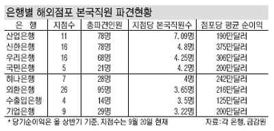 이어 수출입은행이 해외점포당 3.5명, 외환은행은 3.65명을 보내 기업은행의 뒤를 이었고 하나은행 4명, 국민은행 4.2명, 우리은행 4.25명의 순으로 나타났다. 통상 3∼4명가량을 해외점포 관리자로 내보낸 것이다.