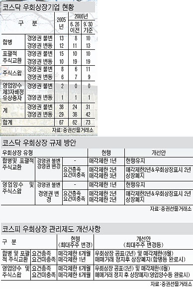 증권선물거래소 관계자는 “우회상장 요건 충족 여부에 따라 상장폐지(미충족시) 또는 우회상장기업임을 공표(충족시)하는 시장 조치를 취하는 게 규제 강화안의 주요 내용”이라고 말했다.