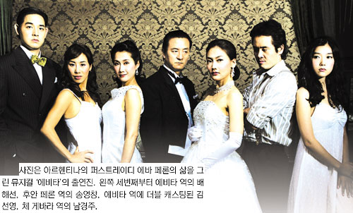 이밖에도 에바 페론의 연인이자 아르헨티나 대통령인 후안 페론 역은 지난 99년 ‘브로드웨이 42번가’ 이후 7년만에 다시 뮤지컬 무대에 서는 송영창이 맡았다. 또 에바 페론에 의해 내침을 당하는 후안 페론의 정부 역에는 ‘갬블러’의 김소향과 그룹 키스 출신의 우금지, 에바 페론을 브에노스아이레스로 인도하는 에바의 첫 남자 마갈디 역에는 맨하튼 음대 출신의 신예 박상진이 각각 캐스팅됐다. 3만∼9만원. (02)501-7888