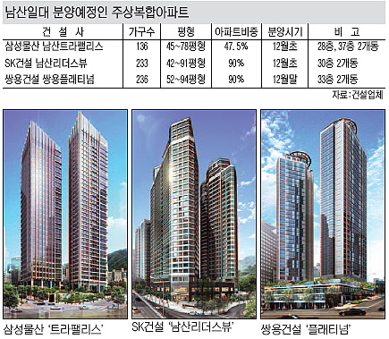 삼성물산의 남산트라팰리스와 SK건설의 남산리더스뷰는 내달초 분양 일정에 돌입할 것으로 알려졌으며 분양가는 2100만원 선인 것으로 알려졌다. 한편 쌍용건설의 쌍용플래티넘은 설계수정으로 인해 예정보다 다소 늦은 오는 12월 말께 분양할 예정이다.
