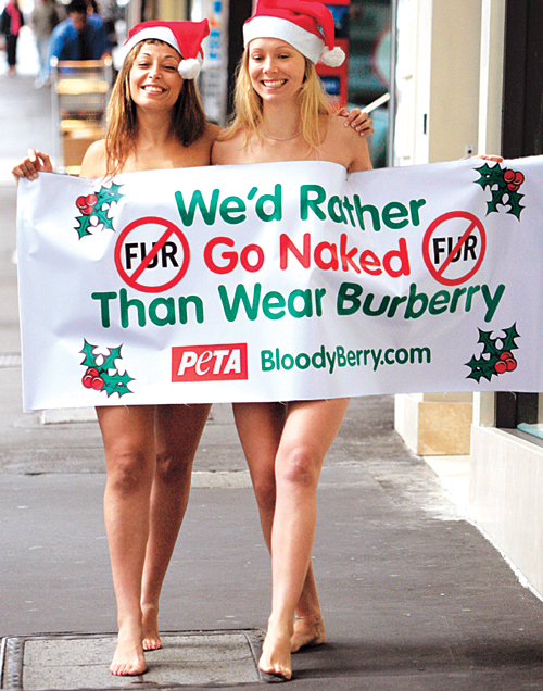 국제동물보호단체인 윤리적동물보호(PETA)의 여성 회원 2명이 추운 날씨 속에 ‘버버리를 입는 것보다는 누드가 낫다’는 플래카드를 들고 거리에서 시위를 하고 있다. PETA는 모든 위해로부터 동물 보호를 목적으로 하고 있다.