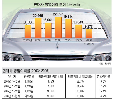 해외 판매 비중이 70% 이상인 현대차의 영업이익에 직접적인 영향을 미치는 원·달러 환율은 2003년 평균 1192원이었지만 2004년 1139원, 2005년에는 1023원, 2006년 950원가량으로 지속 하락하면서 기회이익 상실이 컸다.