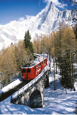■사진설명=빨간 등산열차라고 불리는 이 '몽블랑 익스프레스'는 스위스의 마티니에서 출발, 샤라드 프론티어를 거쳐 샤모니 몽블랑에 도착한다.