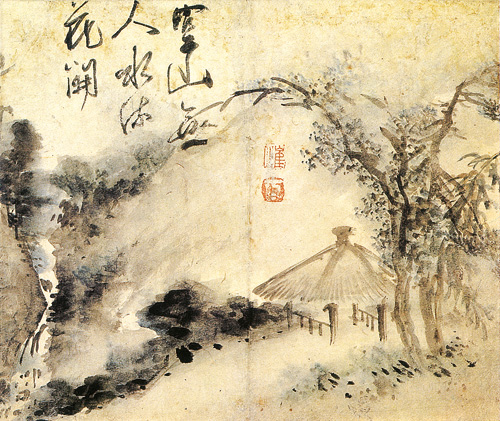 이 그림은 중국의 유명한 시인 소식의 시 구절을 그림으로 옮긴 것이다. 즉 “빈산에 아무도 없는데 물은 흐르고 꽃은 핀다.” 그림의 위쪽에 적힌 화제가 그것이다. 비록 시에서 몸을 얻었지만 시에 종속되지 않는, 독자적인 경지를 보여준다.