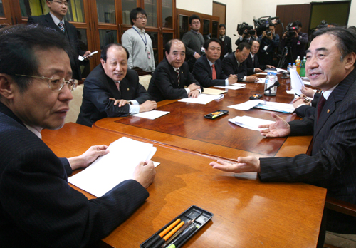 이상수 노동부 장관이 16일 오후 국회 환노위에서 열린 긴급간담회에 참석, 홍준표 환노위원장 등 위원들에게 현대자동차 노조의 파업 사태와 관련한 보고를 하고 있다.