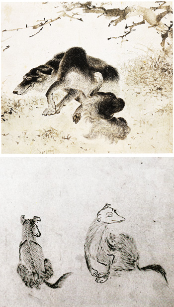 ■도판설명=김두량, ‘흑구도’, 종이에 수묵, 23.0×26.3㎝, 18세기 중반, 국립중앙박물관 소장(위 작품) 조영석, ‘강아지’, 종이에 수묵, 28.5×20.5㎝, 18세기 중반, 서울 종가 소장