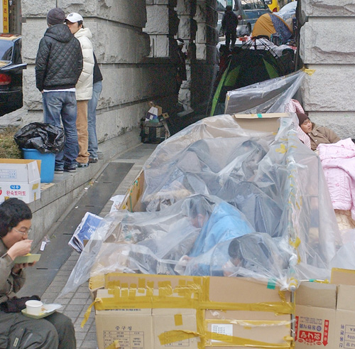 새 1만원권 및 1천원권 발행을 하루 앞둔 21일 서울 남대문 한국은행 화폐교환창구 앞에서 신권 지폐를 확보하려는 시민들이 박스,비닐 등으로 바람을 막으며 장사진을 이루고 있다.