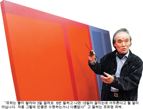워낙 ‘연출하기를 싫어한다’는 예술원 회원 유희영(67) 화백은 작품 앞에서 한번 웃어보라고 하자 손사래를 쳤다.