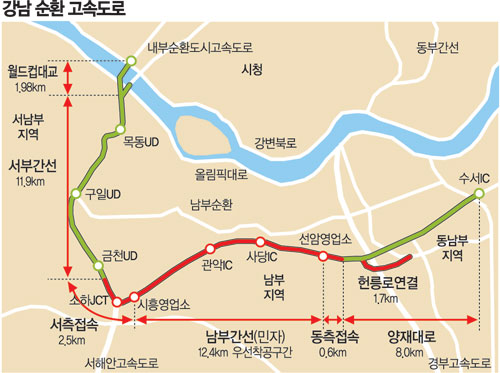한편, 강남순환 도시고속도로 가운데 성산대교 남단에서 시흥까지의 11.9km 서부간선구간은 이번 착공에서 제외된다.