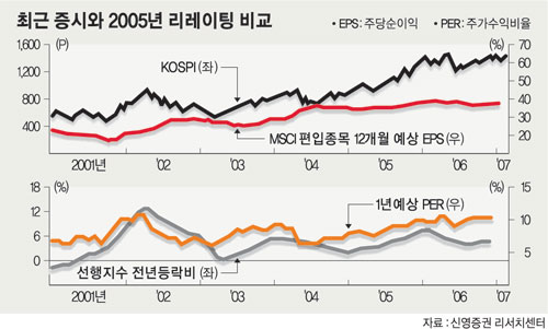 이에 따라 한국증시가 지난 2005년에 이어 2차 리레이팅(재평가)에 돌입했다는 분석이 나오고 있다. 기업실적이나 경기모멘텀 측면에서 2005년과 유사한 증시환경에 처해 있다는 것. 특히 과열 논란에도 중국·인도 등 신흥 이머징 시장의 부상은 한국증시의 제2차 리레이팅을 기대하는 가장 확실한 근거라는 주장이다.