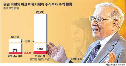 버크셔 헤서웨이 투자 목록을 살펴보면 그 동안 이 회사는 세계 주식시장에 229억9500만달러(21조6382억원)를 투자해 615억3300만달러(57조9026억원)로 불리는 등 놀라운 투자 수완을 발휘했다.