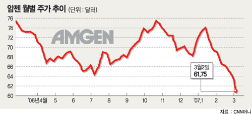 암젠사의 비공식조사 사실이 발표된 후 투자자들은 이 주식을 집중 매도하면서 주가가 61달러 선으로 곤두박질쳤다. 올해 초만 해도 암젠의 주가는 74달러 선을 호가했다.