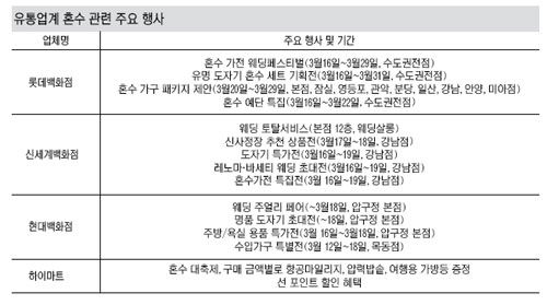 백화점과 대형마트, 전자전문점 등 주요 유통업체들이 본격적인 웨딩시즌을 맞아 예비부부들을 겨냥한 다양한 마케팅에 시동을 걸었다. 각 사들은 혼수 도우미를 자처하며 상품별 할인행사는 물론 혼수 구매 금액의 일정 부분을 적립해 상품권으로 돌려주는 혜택도 제공중이다.