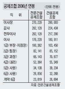 14일 전문건설공제조합에 따르면 2006년 기준으로 임원급(이사∼이사장) 연봉이 1억7622만∼2억7022만원에 달하는 것으로 조사됐다. 전문건설공제조합은 3만8000여 전문건설업체의 공사 보증과 융자업무를 맡아 수행하는 곳이다.