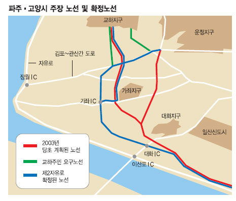 해당 광역단체인 경기도는 입장이 더 단호하다. 도 관계자는 “사실 제2자유로 노선이 우회하게 된 것은 물론 고양시민의 민원에 따른 영향을 배제할 수는 없다”면서도 “그러나 교하주민들의 요구대로 또 다시 노선을 변경하게 되면 앞으로 사업하기가 힘들어진다”며 더 이상 민원에 휘둘리지 않겠다는 입장을 분명히 했다.