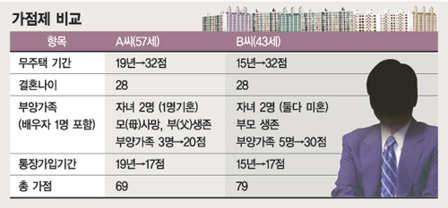 예시에서 보듯 무주택자인 57세 A씨는 총 가점이 69점으로 43세인 B씨보다 10점이 낮다.