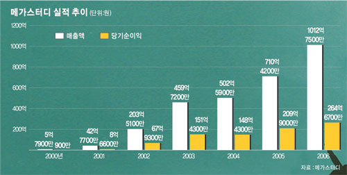 지난 2000년 7월 문을 연 메가스터디는 지난 2004년 12월 코스닥시장에 입성했다. 지난해 매출 1012억원, 순이익 264억원을 기록했다. 각각 전년 대비 42.5%, 26%나 증가한 것이다.