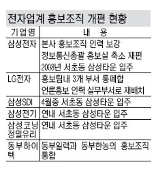 10일 현재 대외 홍보조직에 변화를 시도한 곳은 삼성전자, LG전자, 삼성SDI, 삼성전기, 삼성코닝정밀유리, LG필립스LCD, 동부일렉 등.