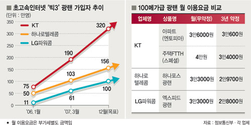 KT는 최근 요금제를 속도별로 바꾸면서 100메가급 상품은 2종(아파트용, 주택용)으로 구분했다. 아파트용 광랜상품(엔토피아)는 월 기본료 3만6000원(무약정), 주택지역 FTTH(메가패스 스폐셜)는 월 이용료가 4만원(무약정)이다.