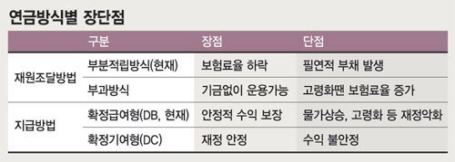 연금 부채가 쌓이는 것은 부분적립방식과 확정급여(DB)형을 기반으로 하고 있는 우리의 연금제도의 특성 탓이 크다. 부분적립방식이란 가입자가 낸 보험료로 기금을 조성해 나중에 그 기금에서 연금을 받는 것이고 DB형 지급방식은 생애평균 소득의 60%를 연금으로 주는 것이다.