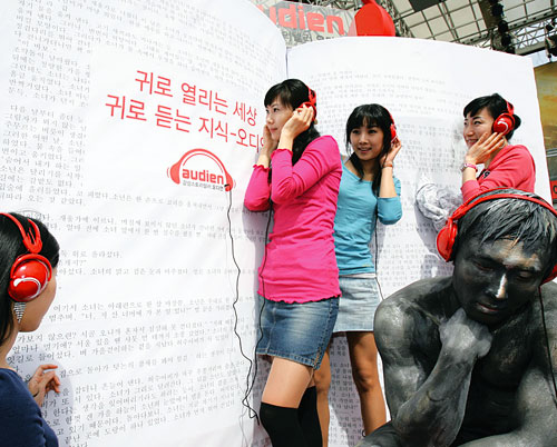 디지털 오디오 콘텐츠 포털 오디언닷컴은 세계 독서의 날인 23일 서울 동대문 두산타워 앞에서 대형 책 모형에 이어폰을 꽂으면 오디오북을 들을 수 있는 행사를 열었다.
