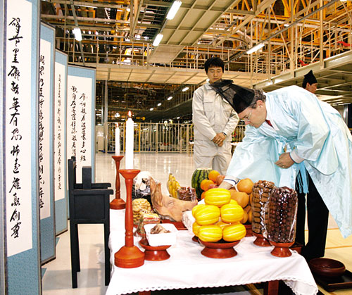 르노삼성자동차는 올 연말 출시 예정인 ‘크로스오버(H45)’의 성공과 안전생산을 기원하는 기원제를 부산공장에서 2일 올렸다.