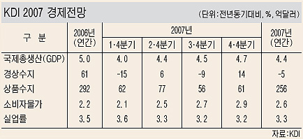 이에 따라 성장률 전망치를 지난해 말 4.4% 유지했다. KDI는 우리 경제가 1·4분기(4.0%)에 저점을 통과해 4·4분기에 4.7%까지 상승세를 이어갈 것으로 전망했다.