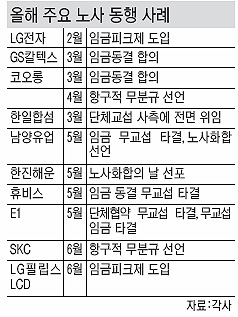 지난 2004년 극심한 노사분규를 겪은 후 모범적인 노사관계를 보여 주고 있는 GS칼텍스는 지난 3월 임금동결에 합의했고 한일합섬은 같은 달 단체교섭권을 사측에 전면 위임했다. 또 남양유업과 휴비스는 각각 임금 무교섭 타결을 이뤄냈고 E1은 단체협약 무교섭 타결을 이뤄냈다.