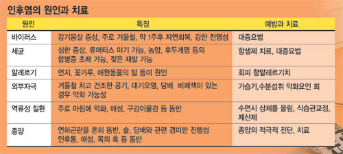 또 다음과 같은 증상이 있는 경우에는 반드시 이비인후과 전문의의 검사가 필요하다. △심한 인후통 △통증이나 기침이 5∼7일 이상 지속 △호흡 곤란 △음식을 삼키기 곤란함 △입을 벌리기 어려움 △고열 동반 △발진 동반 △침에 피가 섞여 나옴 △자주 재발 △목에 혹이 만져짐 △2주 이상 계속되는 목소리의 변화(애성)