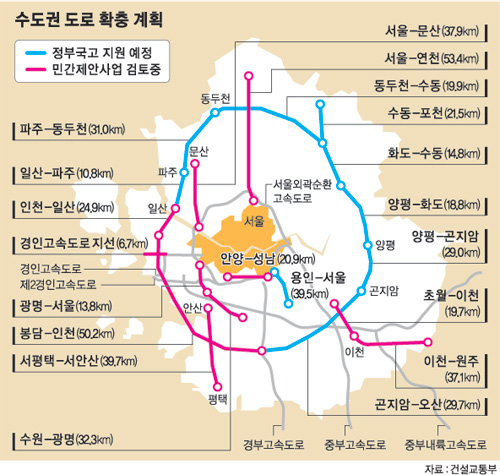 경부고속도로를 축으로 경기 화성 동탄,성남 판교,용인 흥덕지구 등 신도시와 택지지구가 ‘포도송이’처럼 생기면서 경기 남부권의 교통문제가 가장 큰 현안으로 떠 올랐다. 정부는 동탄신도시∼영통, 세교∼동탄, 동탄∼1번 국도 등 수도권 남부지역 교통난 해소를 위해 21개 도로를 신규 개설하거나 확장하겠다고 발표했다.