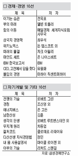 연구소가 추천한 경제.경영 도서로는 △이기는 습관(전옥표) △부의 미래(앨빈 토플러) △힘의 이동(매일경제 세계지식포럼 사무국) △삼국지 경영학(최우석) △위키노믹스(돈 탭스코트 외) △미래의 물결(자크 아탈리) △마인드 세트(존 나이스비트) △IBM 한국보고서(IBM) △CEO, 고전에서 답을 찾다(유필화) △몰입의 경영(미하이 칙센트미하이) 등이 꼽혔다.