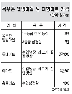 롯데마트는 수입쇠고기 냉장 꽃갈비살을 1㎏당 3만9500원에 판매하고 있으며 이마트의 경우 수입 냉동 진갈비살을 3만800원에 판매하고 있다. 홈플러스는 수입삼겹살을 1㎏당 9800원선에 판매하고 있다.