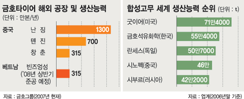 금호타이어는 올 7월 중국 창춘에 타이어공장을 준공해 중국에만 모두 3군데 공장을 갖고 있으며 베트남 빈증성에도 연 315만본의 대형 타이어 공장을 내년 상반기 가동하게 된다.