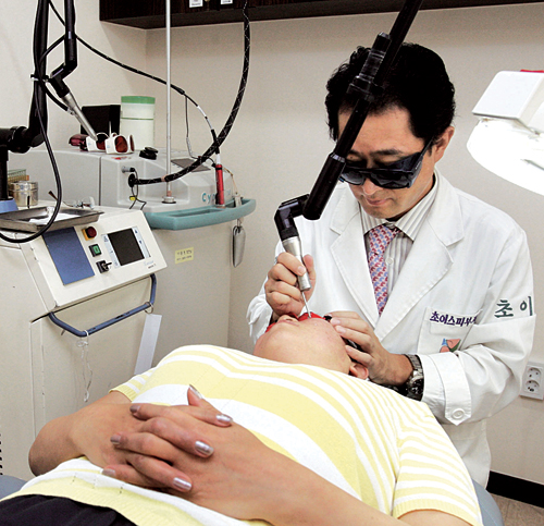 ■사진설명=초이스피부과 최광호 대표원장이 레이저로 환자의 여드름을 치료하고 있다.