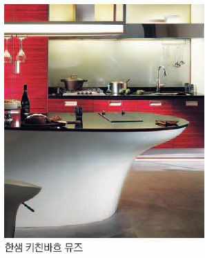 한샘은 올해 와인바 형태의 아일랜드를 컨셉트로 하는 키친바흐 뮤즈’ 시리즈를 출시했다. 뮤즈의 ‘키친바흐 아일랜드’는 와인잔의 흐르는 듯한 곡선과 조선시대 백자 실루엣을 접목시켜 부드러운 서양의 곡선과 정중동의 동양적 디자인을 조화시켰다.