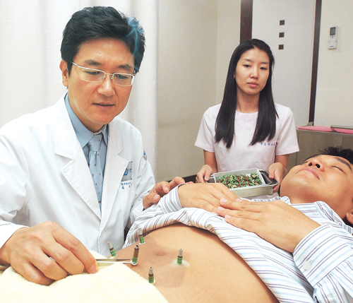 ■사진설명=전립선염에 한방 치료가 과학적이지 못하다는 편견을 깨기 위해 논문을 제출하는 등 백방으로 노력하고 있는 일중한의원 손기정 원장이 환자를 진료하고 있다.