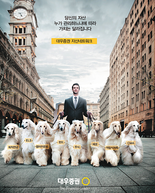 대우증권의 새 광고는 어려워 보이는 자산관리를 쉽게 알리기 위해 여러 마리의 명견들을 등장시켜 눈길을 끌고 있다.